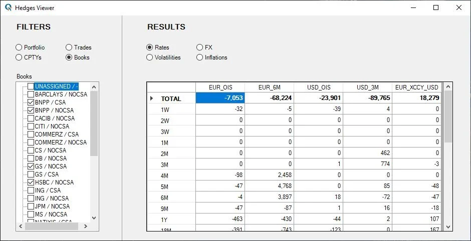 Hedges can be viewed at different granularity levels: trade, book, counterparty or whole portfolio.